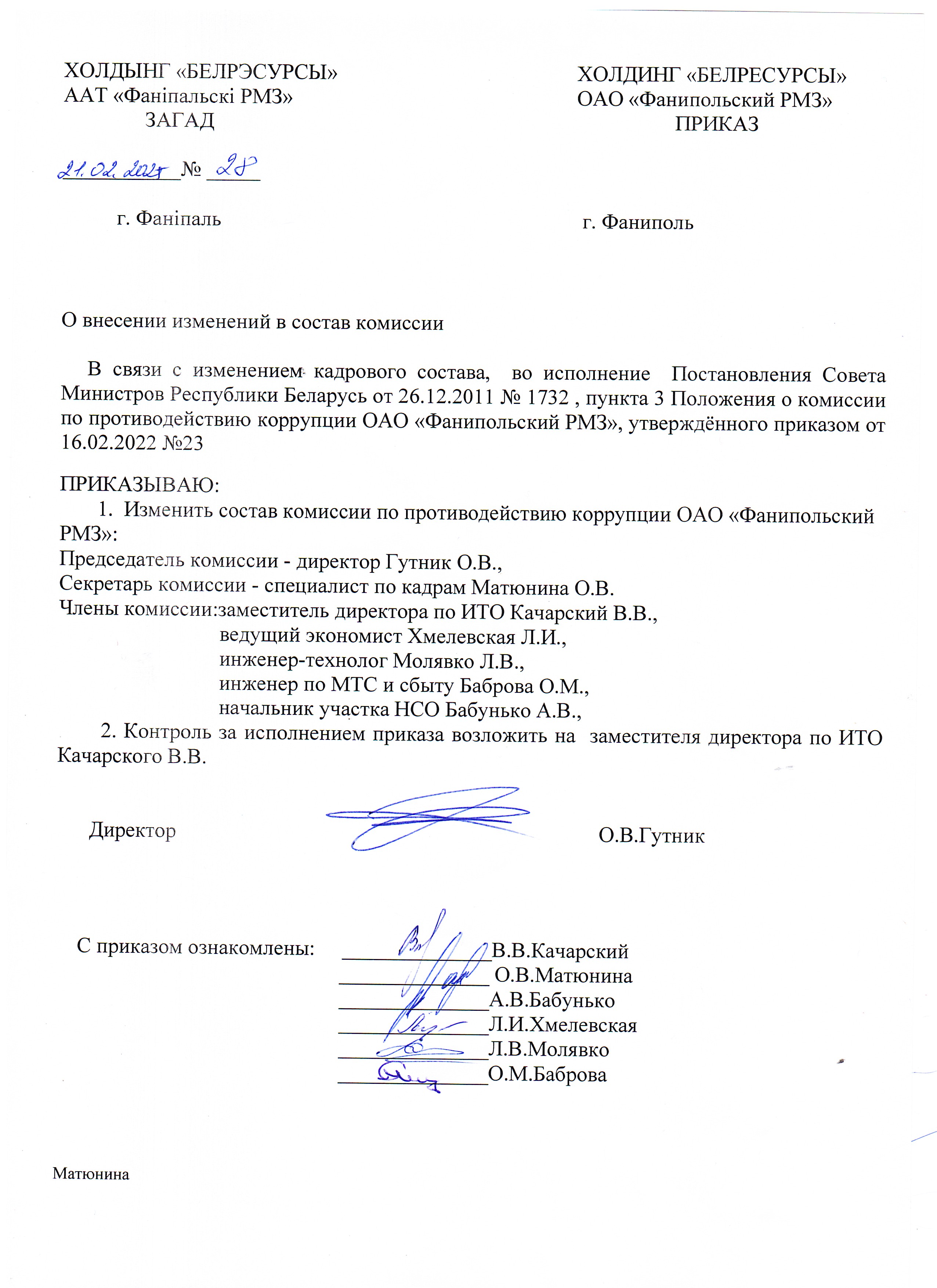 - Гутник О. В. (председатель комиссии по противодействию коррупции)- 8-01716-4-72-67